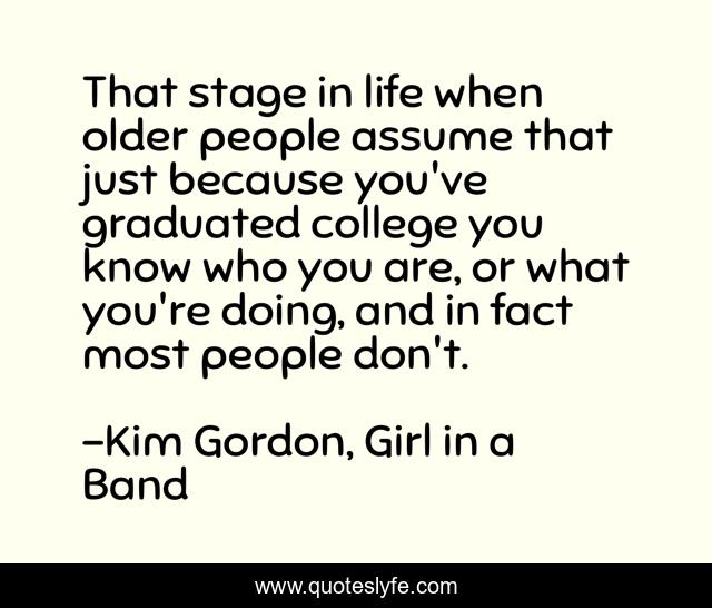 This page presents the quote "That stage in life when older people assume that just because you've graduated college you know who you are, or what you're doing, and in fact most people don't.". Author of this quote is Kim Gordon, Girl in a Band. .
