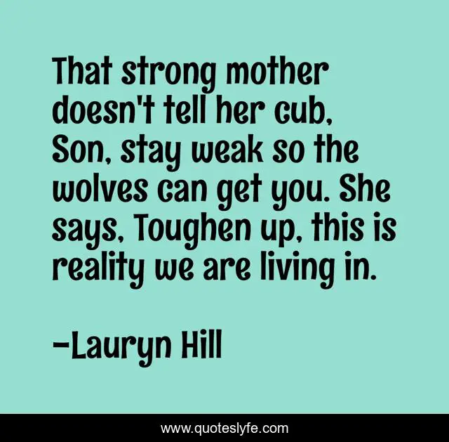 This page presents the quote "That strong mother doesn't tell her cub, Son, stay weak so the wolves can get you. She says, Toughen up, this is reality we are living in.". Author of this quote is Lauryn Hill. This quote is about son, strong, mother,.