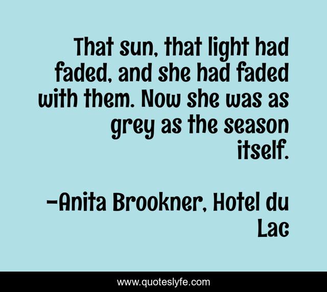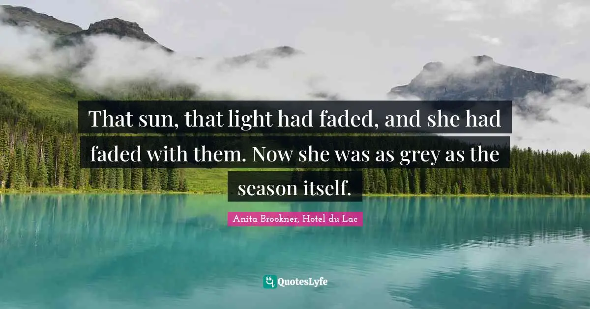 This page presents the quote "That sun, that light had faded, and she had faded with them. Now she was as grey as the season itself.". Author of this quote is Anita Brookner, Hotel du Lac. This quote is about grief, melancholy, hopelessness, sadness,.