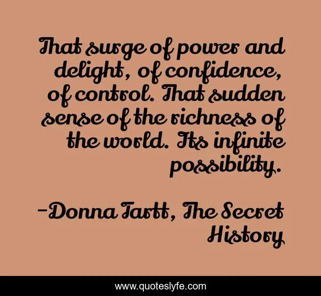 This page presents the quote "That surge of power and delight, of confidence, of control. That sudden sense of the richness of the world. Its infinite possibility.". Author of this quote is Donna Tartt, The Secret History. This quote is about control, confidence, possibility, power,.
