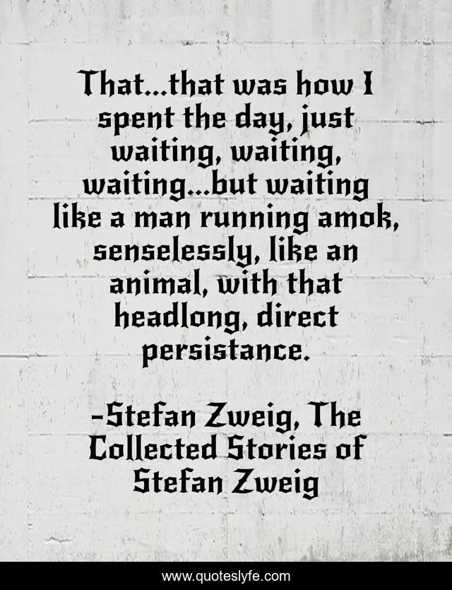 This page presents the quote "That...that was how I spent the day, just waiting, waiting, waiting...but waiting like a man running amok, senselessly, like an animal, with that headlong, direct persistance.". Author of this quote is Stefan Zweig, The Collected Stories of Stefan Zweig. This quote is about amok, waiting,.