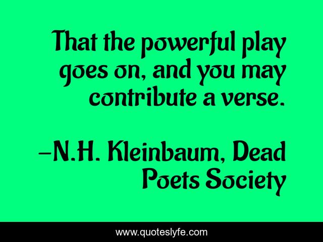 This page presents the quote "That the powerful play goes on, and you may contribute a verse.". Author of this quote is N.H. Kleinbaum, Dead Poets Society. This quote is about society, poets, dead,.