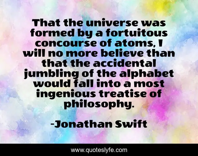This page presents the quote "That the universe was formed by a fortuitous concourse of atoms, I will no more believe than that the accidental jumbling of the alphabet would fall into a most ingenious treatise of philosophy.". Author of this quote is Jonathan Swift. This quote is about intelligent-design, science,.