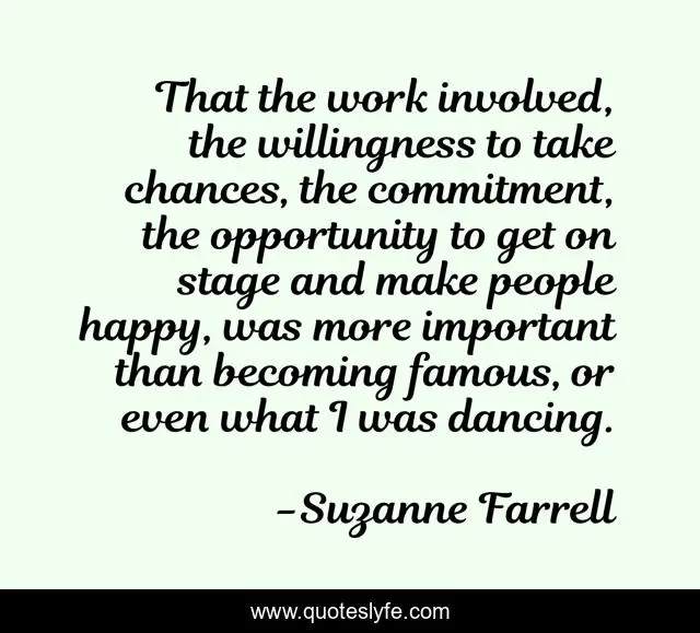 This page presents the quote "That the work involved, the willingness to take chances, the commitment, the opportunity to get on stage and make people happy, was more important than becoming famous, or even what I was dancing.". Author of this quote is Suzanne Farrell. This quote is about work, opportunity, happy,.