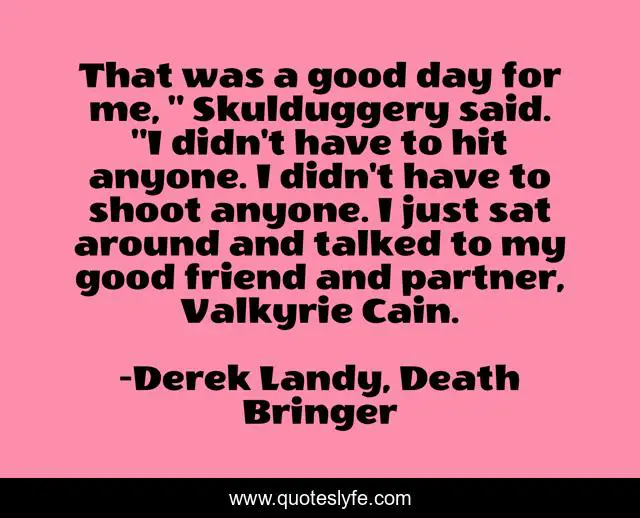This page presents the quote "That was a good day for me, " Skulduggery said. "I didn't have to hit anyone. I didn't have to shoot anyone. I just sat around and talked to my good friend and partner, Valkyrie Cain.". Author of this quote is Derek Landy, Death Bringer. .