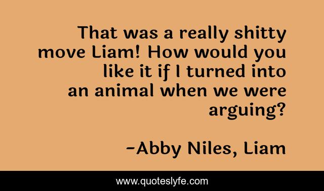 This page presents the quote "That was a really shitty move Liam! How would you like it if I turned into an animal when we were arguing?". Author of this quote is Abby Niles, Liam. This quote is about shifters, entangled, paranormal-romance,.