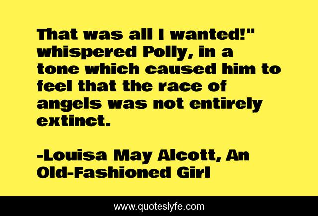 This page presents the quote "That was all I wanted!" whispered Polly, in a tone which caused him to feel that the race of angels was not entirely extinct.". Author of this quote is Louisa May Alcott, An Old-Fashioned Girl. This quote is about chapter-19, an-old-fashioned-girl, louisa-may-alcott, angels,.