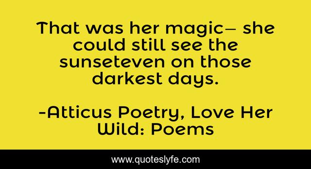 This page presents the quote "That was her magic— she could still see the sunseteven on those darkest days.". Author of this quote is Atticus Poetry, Love Her Wild: Poems. This quote is about atticus, love, instagram, her, atticuspoetry, poetry, quotes, wild, poems,.