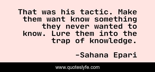 This page presents the quote "That was his tactic. Make them want know something they never wanted to know. Lure them into the trap of knowledge.". Author of this quote is Sahana Epari. This quote is about reason, evil, tactic,.