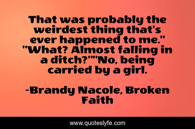 This page presents the quote "That was probably the weirdest thing that's ever happened to me." "What? Almost falling in a ditch?""No, being carried by a girl.". Author of this quote is Brandy Nacole, Broken Faith. This quote is about angel, kayson, sabrina, humurous, vampire,.