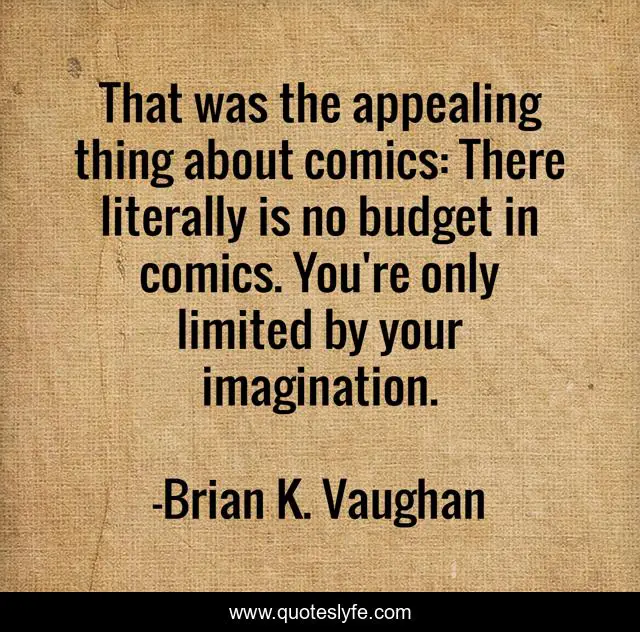 This page presents the quote "That was the appealing thing about comics: There literally is no budget in comics. You're only limited by your imagination.". Author of this quote is Brian K. Vaughan. This quote is about comics, budget,.
