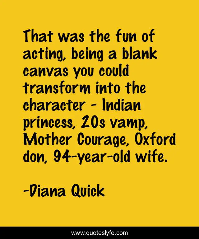 This page presents the quote "That was the fun of acting, being a blank canvas you could transform into the character - Indian princess, 20s vamp, Mother Courage, Oxford don, 94-year-old wife.". Author of this quote is Diana Quick. This quote is about mother, character, wife,.