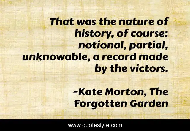 This page presents the quote "That was the nature of history, of course: notional, partial, unknowable, a record made by the victors.". Author of this quote is Kate Morton, The Forgotten Garden. .