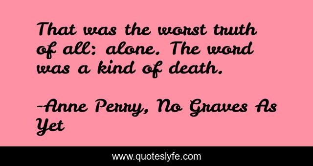 This page presents the quote "That was the worst truth of all: alone. The word was a kind of death.". Author of this quote is Anne Perry, No Graves As Yet. This quote is about alone, aloneness,.