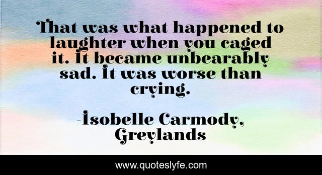 This page presents the quote "That was what happened to laughter when you caged it. It became unbearably sad. It was worse than crying.". Author of this quote is Isobelle Carmody, Greylands. This quote is about caged, laughter, sad,.