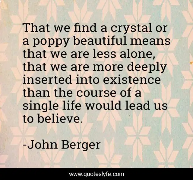 This page presents the quote "That we find a crystal or a poppy beautiful means that we are less alone, that we are more deeply inserted into existence than the course of a single life would lead us to believe.". Author of this quote is John Berger. This quote is about beautiful, life, believe,.