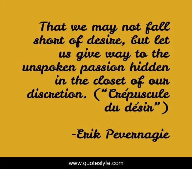 This page presents the quote "That we may not fall short of desire, but let us give way to the unspoken passion hidden in the closet of our discretion. (“Crépuscule du désir”)". Author of this quote is Erik Pevernagie. This quote is about desire, give-way, crépuscule, closet, may, fall-short, unspoken, discretion, passion,.