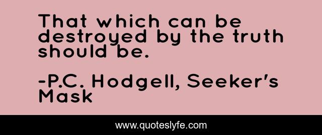 This page presents the quote "That which can be destroyed by the truth should be.". Author of this quote is P.C. Hodgell, Seeker's Mask. This quote is about faith, belief, truth,.