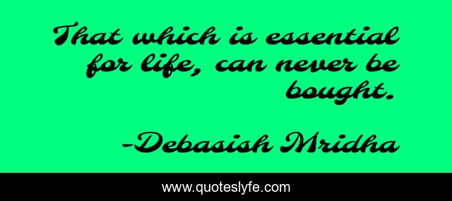 This page presents the quote "That which is essential for life, can never be bought.". Author of this quote is Debasish Mridha. This quote is about life, what-is-life, philosophy, debasish-mridha, quotes, essential-for-life, debasish-mridha-md, inspirational, enthusiasm,.