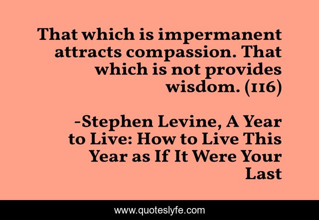 This page presents the quote "That which is impermanent attracts compassion. That which is not provides wisdom. (116)". Author of this quote is Stephen Levine, A Year to Live: How to Live This Year as If It Were Your Last. This quote is about compassion, permanence, impermanence, wisdom,.