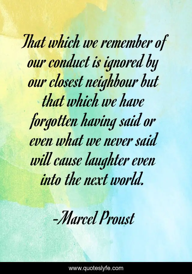 This page presents the quote "That which we remember of our conduct is ignored by our closest neighbour but that which we have forgotten having said or even what we never said will cause laughter even into the next world.". Author of this quote is Marcel Proust. .