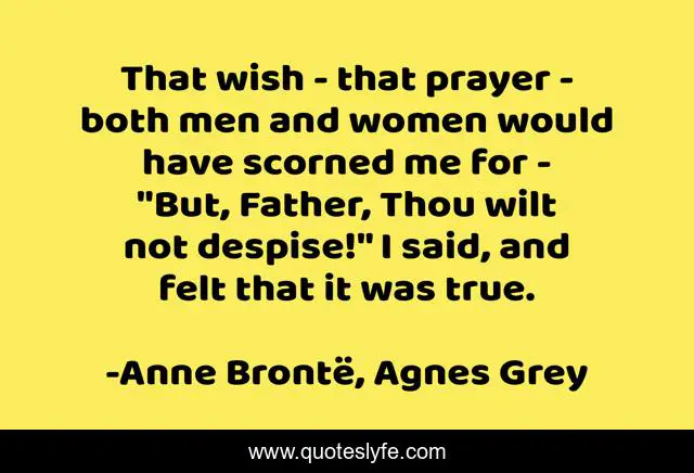This page presents the quote "That wish - that prayer - both men and women would have scorned me for - "But, Father, Thou wilt not despise!" I said, and felt that it was true.". Author of this quote is Anne Brontë, Agnes Grey. This quote is about god, prayer, love, affection, wish,.