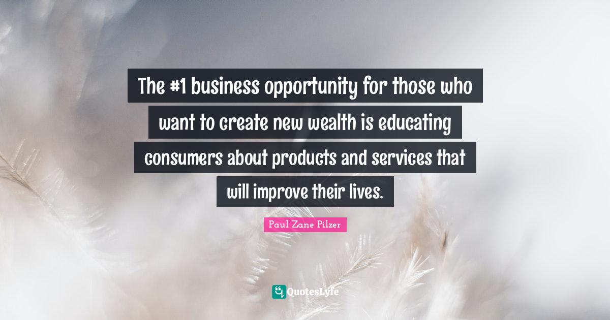 This page presents the quote "The #1 business opportunity for those who want to create new wealth is educating consumers about products and services that will improve their lives.". Author of this quote is Paul Zane Pilzer. This quote is about business, want, consumers, wealth, products, opportunity,.