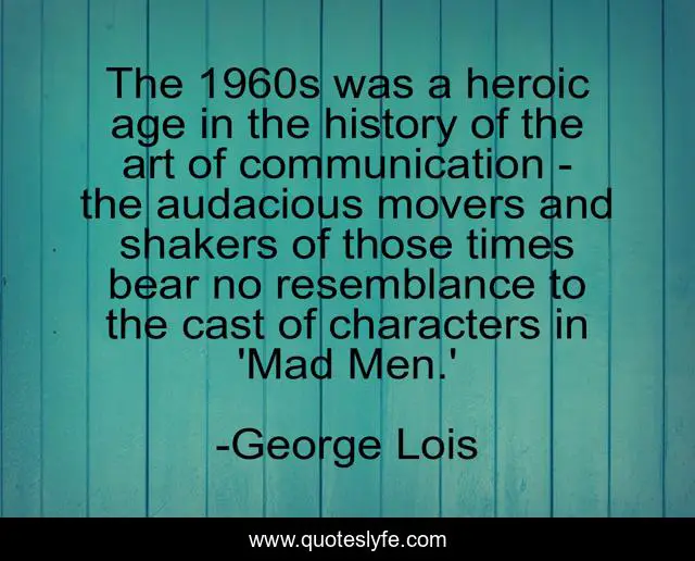 This page presents the quote "The 1960s was a heroic age in the history of the art of communication - the audacious movers and shakers of those times bear no resemblance to the cast of characters in 'Mad Men.'". Author of this quote is George Lois. This quote is about age, art, history,.