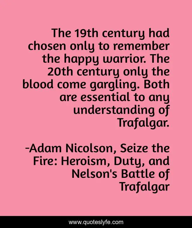 This page presents the quote "The 19th century had chosen only to remember the happy warrior. The 20th century only the blood come gargling. Both are essential to any understanding of Trafalgar.". Author of this quote is Adam Nicolson, Seize the Fire: Heroism, Duty, and Nelson's Battle of Trafalgar. This quote is about honour, trafalgar, blood, warrior,.