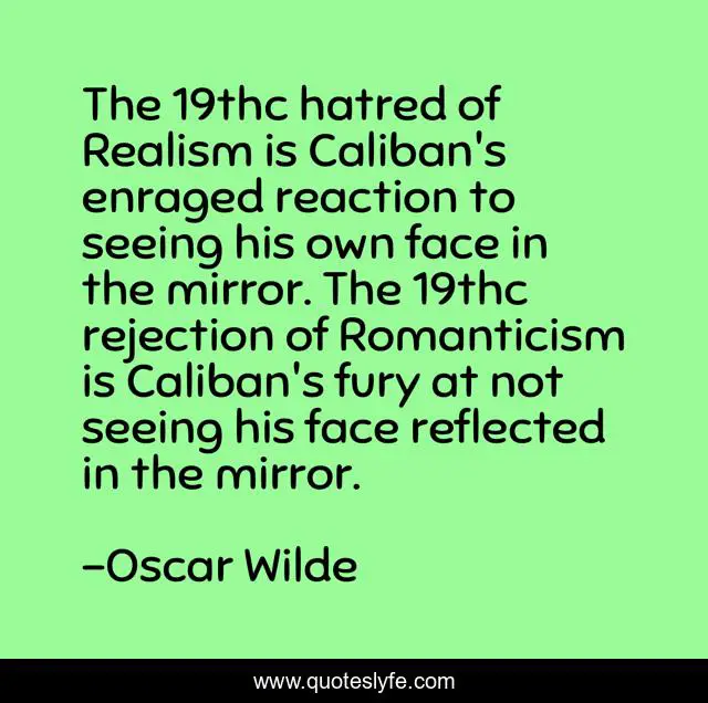 This page presents the quote "The 19thc hatred of Realism is Caliban's enraged reaction to seeing his own face in the mirror. The 19thc rejection of Romanticism is Caliban's fury at not seeing his face reflected in the mirror.". Author of this quote is Oscar Wilde. .