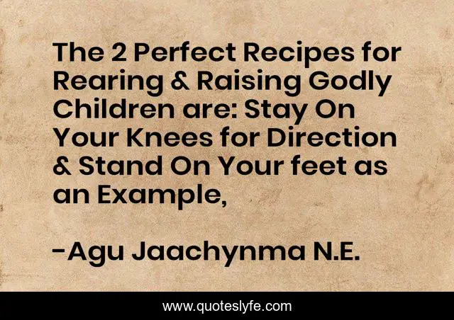 This page presents the quote "The 2 Perfect Recipes for Rearing & Raising Godly Children are: Stay On Your Knees for Direction & Stand On Your feet as an Example, ". Author of this quote is Agu Jaachynma N.E.. This quote is about wisdom-inspirational, children-s-books, parenting-advice, value, motherhood, spiritual-development,.