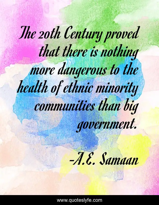 This page presents the quote "The 20th Century proved that there is nothing more dangerous to the health of ethnic minority communities than big government.". Author of this quote is A.E. Samaan. This quote is about ethnic-minorities, diversity, libertarianism, democide, individuality, eugenics, big-government, individual-liberty, bill-of-rights,.