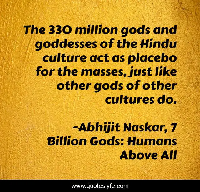 This page presents the quote "The 330 million gods and goddesses of the Hindu culture act as placebo for the masses, just like other gods of other cultures do.". Author of this quote is Abhijit Naskar, 7 Billion Gods: Humans Above All. This quote is about neuropsychology, psychology-of-god, humanism, psychology-of-religion, judaismm, christianity, atheism, religion, hinduism,.