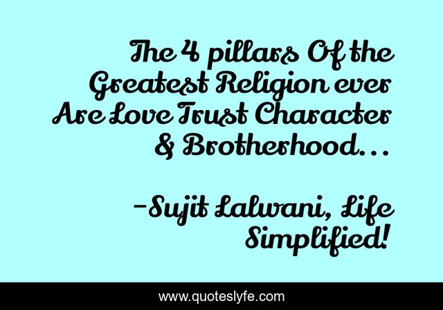 This page presents the quote "The 4 pillars Of the Greatest Religion ever Are Love Trust Character & Brotherhood...". Author of this quote is Sujit Lalwani, Life Simplified!. This quote is about life, motivation, life-lessons, inspiration,.
