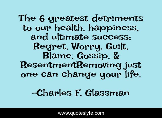 This page presents the quote "The 6 greatest detriments to our health, happiness, and ultimate success: Regret, Worry, Guilt, Blame, Gossip, & ResentmentRemoving just one can change your life.". Author of this quote is Charles F. Glassman. This quote is about life, life-lessons, motivational-inspirational, motivational, confidence, guilt, optimistic, inspirational, positive,.