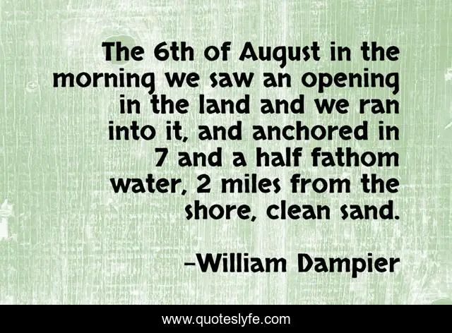 This page presents the quote "The 6th of August in the morning we saw an opening in the land and we ran into it, and anchored in 7 and a half fathom water, 2 miles from the shore, clean sand.". Author of this quote is William Dampier. This quote is about water, sand, opening,.