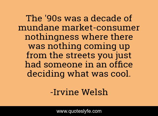 This page presents the quote "The '90s was a decade of mundane market-consumer nothingness where there was nothing coming up from the streets you just had someone in an office deciding what was cool.". Author of this quote is Irvine Welsh. This quote is about nothing, office,.
