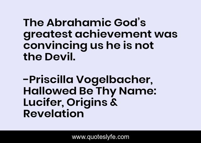 This page presents the quote "The Abrahamic God’s greatest achievement was convincing us he is not the Devil.". Author of this quote is Priscilla Vogelbacher, Hallowed Be Thy Name: Lucifer, Origins & Revelation. This quote is about god, devil, bible,.