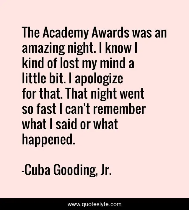 This page presents the quote "The Academy Awards was an amazing night. I know I kind of lost my mind a little bit. I apologize for that. That night went so fast I can't remember what I said or what happened.". Author of this quote is Cuba Gooding, Jr.. This quote is about mind, remember, night,.