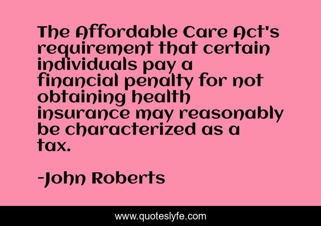 This page presents the quote "The Affordable Care Act's requirement that certain individuals pay a financial penalty for not obtaining health insurance may reasonably be characterized as a tax.". Author of this quote is John Roberts. This quote is about financial, insurance, care,.