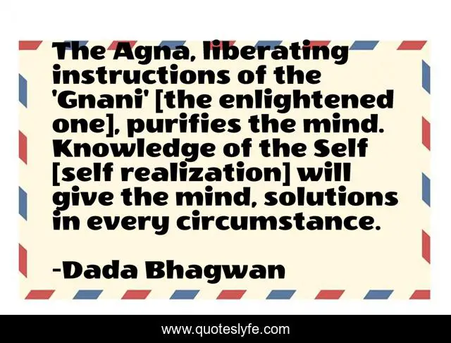 This page presents the quote "The Agna, liberating instructions of the 'Gnani' [the enlightened one], purifies the mind. Knowledge of the Self [self realization] will give the mind, solutions in every circumstance.". Author of this quote is Dada Bhagwan. This quote is about spiritual, purifies-the-mind, self-realization, solution-in-every-circumstances, knowledge-of-te-self, instructions,.