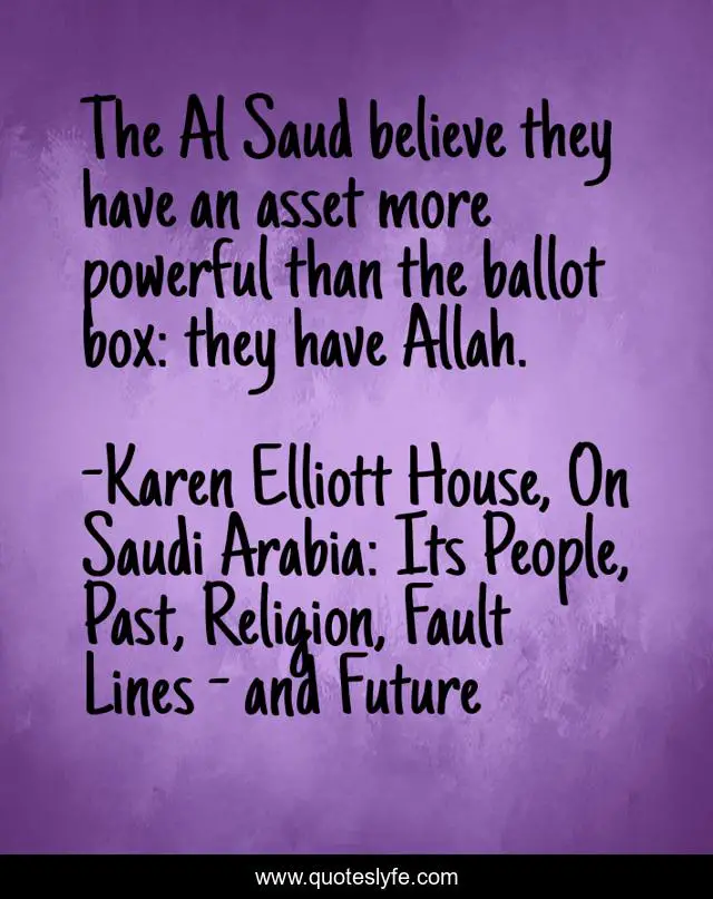 This page presents the quote "The Al Saud believe they have an asset more powerful than the ballot box: they have Allah.". Author of this quote is Karen Elliott House, On Saudi Arabia: Its People, Past, Religion, Fault Lines - and Future. This quote is about saudi-arabia, political, history,.