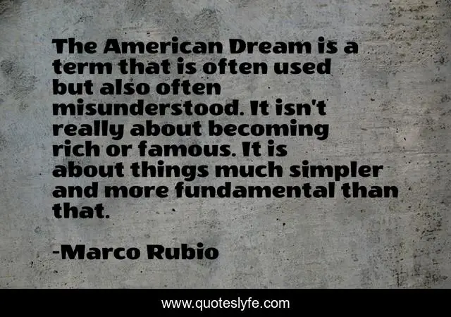 This page presents the quote "The American Dream is a term that is often used but also often misunderstood. It isn't really about becoming rich or famous. It is about things much simpler and more fundamental than that.". Author of this quote is Marco Rubio. This quote is about american dream, american,.