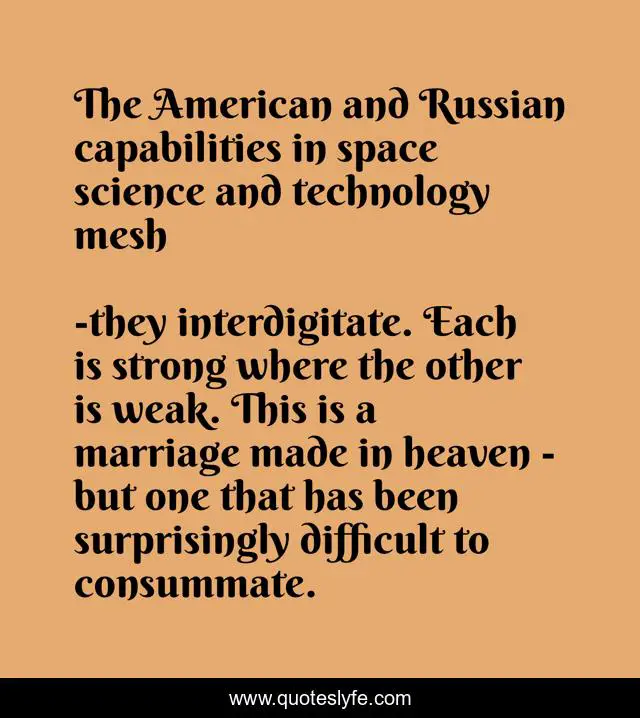 "they interdigitate. Each is strong where the other is weak. This is a marriage made in heaven - but one that has been surprisingly difficult to consummate. Quotes." Quoteslyfe.com, 2025. Fri. 05 Dec. 2025. <https://www.quoteslyfe.com/quote/The-American-and-Russian-capabilities-in-space-191669>.