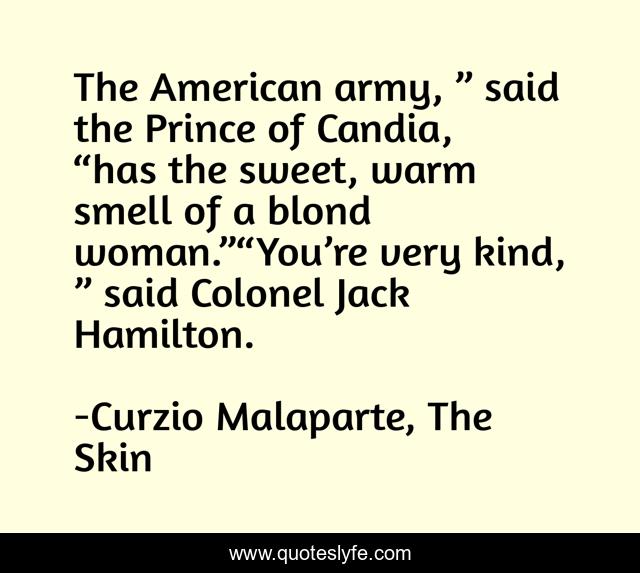This page presents the quote "The American army, ” said the Prince of Candia, “has the sweet, warm smell of a blond woman.”“You’re very kind, ” said Colonel Jack Hamilton.". Author of this quote is Curzio Malaparte, The Skin. This quote is about woman, smell, american-army, blond,.