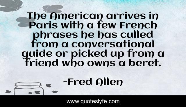 This page presents the quote "The American arrives in Paris with a few French phrases he has culled from a conversational guide or picked up from a friend who owns a beret.". Author of this quote is Fred Allen. This quote is about travel, travellers,.