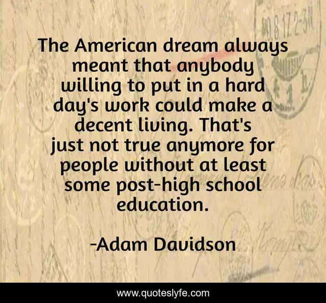 This page presents the quote "The American dream always meant that anybody willing to put in a hard day's work could make a decent living. That's just not true anymore for people without at least some post-high school education.". Author of this quote is Adam Davidson. This quote is about school, work, day,.