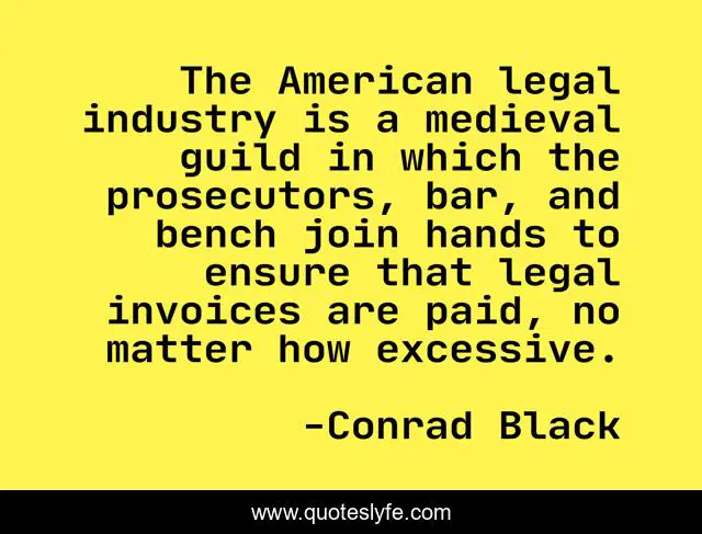 This page presents the quote "The American legal industry is a medieval guild in which the prosecutors, bar, and bench join hands to ensure that legal invoices are paid, no matter how excessive.". Author of this quote is Conrad Black. This quote is about matter, american, hands,.