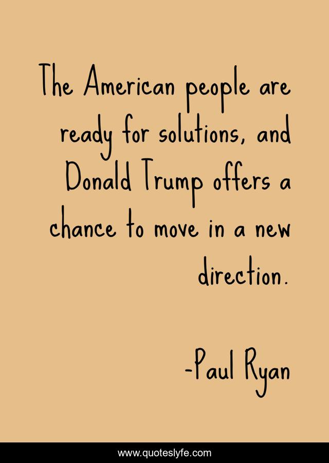 This page presents the quote "The American people are ready for solutions, and Donald Trump offers a chance to move in a new direction.". Author of this quote is Paul Ryan. This quote is about american, direction, people,.