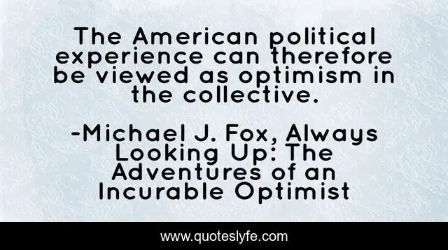 This page presents the quote "The American political experience can therefore be viewed as optimism in the collective.". Author of this quote is Michael J. Fox, Always Looking Up: The Adventures of an Incurable Optimist. This quote is about politics, america, hope, optimism, worldview,.